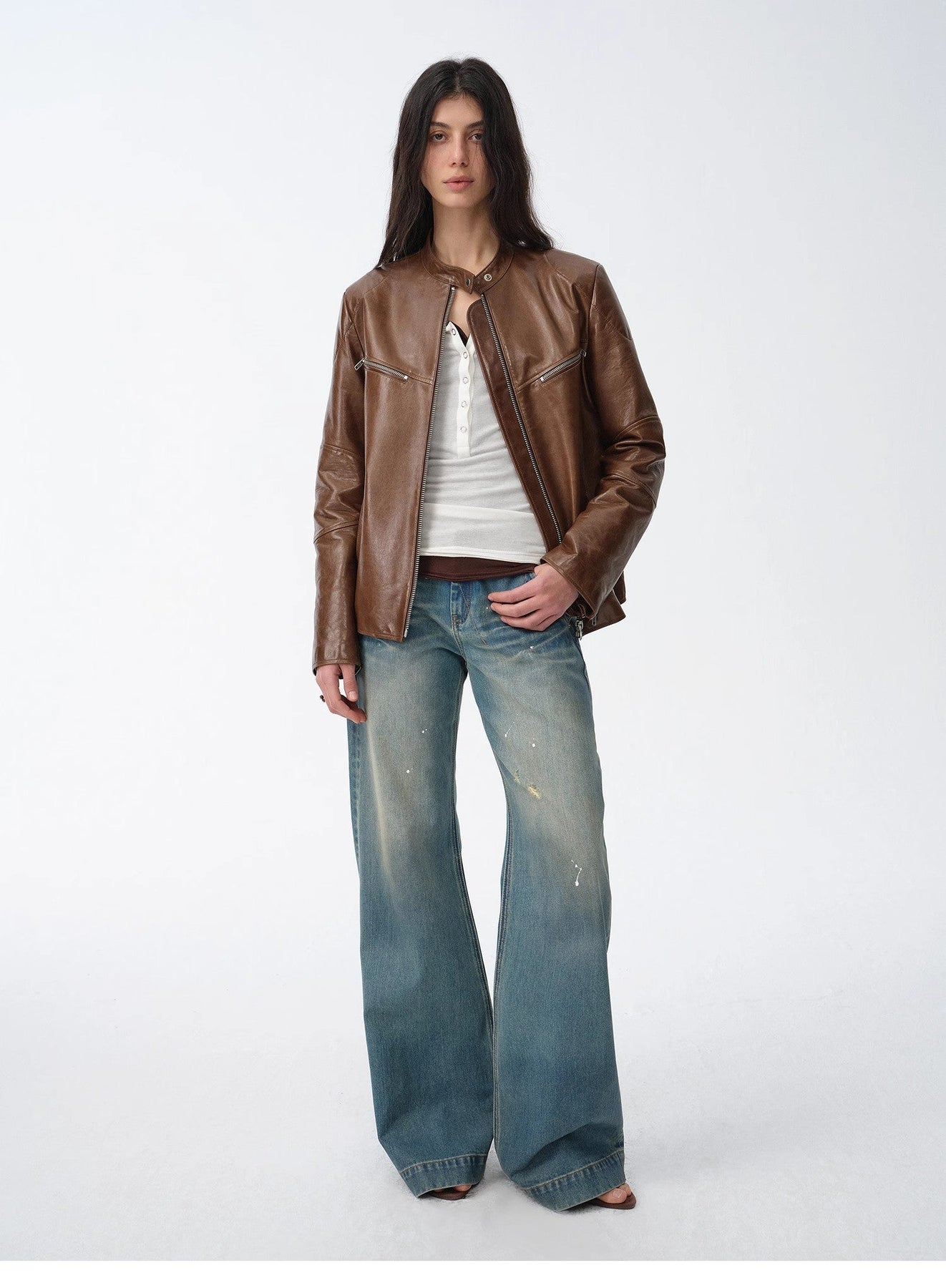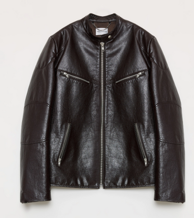 Straight-fitting, slightly waisted, and dropped-sleeves motorcycle jacket
